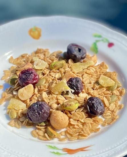 繊細なブルーベリーの甘さと酸味を活かすため、甘みを抑えめにし、マカダミアナッツとピスタチオを合わせています。国産レモンのドライを最後に散らして、夏らしいさわやかな香りのグラノーラです。